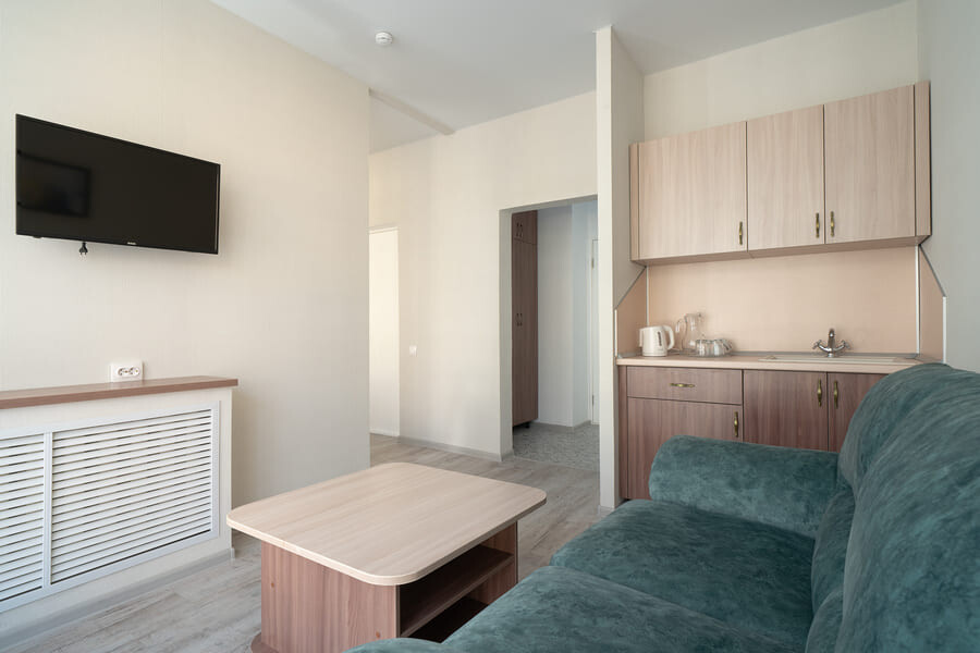 Номера не приспособлены для размещения гостей с ограниченными возможностями. Комплектация номера и цветовая гамма может отличаться от заявленной в описании и представленной на фотографиях. Номер комфорт 1 категории двухкомнатный. Номер состоит из гостиной и спальной комнат. В спальной комнате большая двуспальная кровать, в гостиной — диван. Размещение до 4-х человек. В номере большой телевизор, холодильник, стол, 2 стула. Электрический чайник, посуда. В ванной комнате ванна, фен, брендированные полотенца. Номер с кондиционером. Большая светлая прихожая с подставкой для багажа и шкафом-купе для одежды.